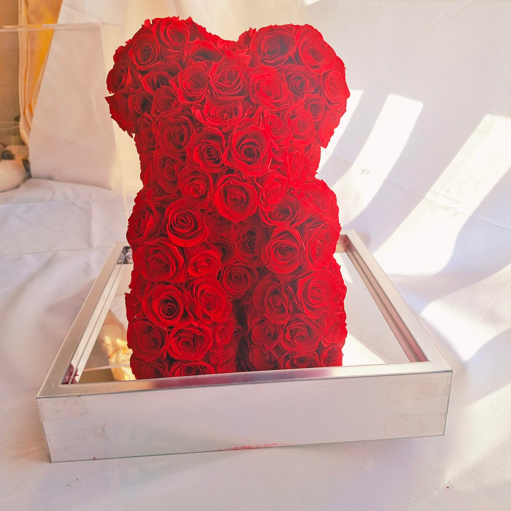 Every teddy bear holds the real eternal roses that stays stunning for years. A symbol of love that never fades.