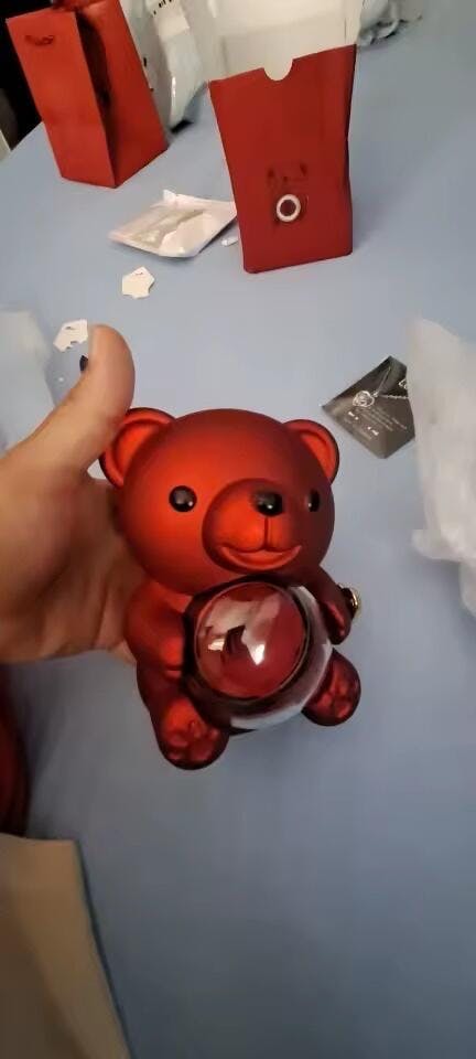 Inside the bear is a necklace with your names engraved on two hearts. It's made to shine and safe for sensitive skin.